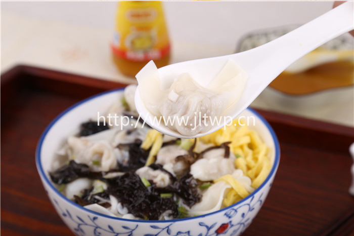 3.將煮熟的餛飩撈出加入到?jīng)_好雞汁的湯碗中,將稱量好的佐料加入湯中,滴入香油即可。